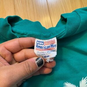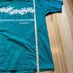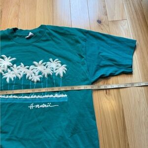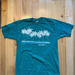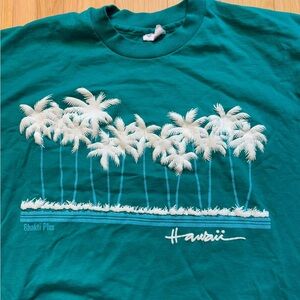 Teal t-shirt with a white palm tree graphic. Features 'Hawaii' text. Casual and stylish. 90’s single stitch made in USA