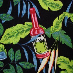 Hawaiian Button Down Shirt Loose Fit Hot Sauce Drinks Cocktails Palm Leaves Black Green Blue ~ Size Medium ~ 100% Rayon (flowy) ~ by Puritan