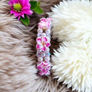 Hawaiian Tropical Plumeria Faux Glass Baby Pink Pearl Beaded Bracelet—a true artisan treasure. Handcrafted with love, this exquisite bracelet features 6mm glass pearl beads, vibrant Fimo plumeria clay flower beads, delicate 3mm clear crystal beads, and soft pink seed beads. Silver-plated hardware adds a touch of elegance. Perfectly capturing the essence of tropical beauty, this unique piece brings a splash of paradise to your style. Elevate your accessory collection with this handcrafted gem. Measures 7.5" with 2 inch extender chain.