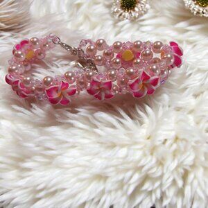 Hawaiian Tropical Plumeria Faux Glass Baby Pink Pearl Boho Beaded Bracelet