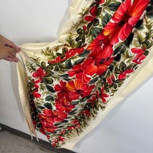 • Color: Cream base with bold tropical red hibiscus and lush green leaf print