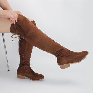 Hawkwell Women's Brown Low Flat Heel Thigh High Over The Knee Fashion Boots