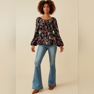 Hayden Los Angeles Floral Foliage Print Twist Front Peplum Top Long Sleeve