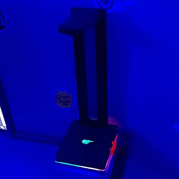 holds and charges your headset, 2 USB, 1 aux jack, and button to change colour of headset stand