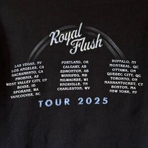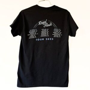 Rock classic style with this Heart 2025 Royal Flush Tour T-shirt. Made from soft black cotton, this tee features the band’s iconic Heart logo in a bold print on the front. The back showcases all the U.S. and Canada tour stops from their 2025 run. A must-have for any fan or band tee collector, perfect for casual wear or layered under a denim jacket for a cool, retro look. In good condition.