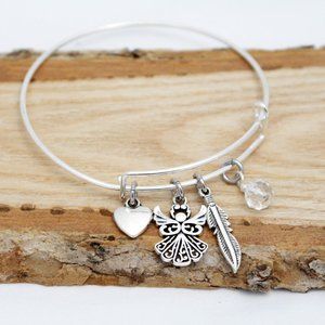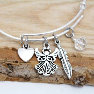Heart, Angel & Feather Adjustable Charm Bangle - Handcrafted Hypoallerge…