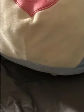 Couple stains and large ink mark. Can be removed if treated properly. Canadian valentines exclusive squishmallow, was worth upwards of $200 at some point but it’s 2026 and obviously squishmallows hold no value now lol.