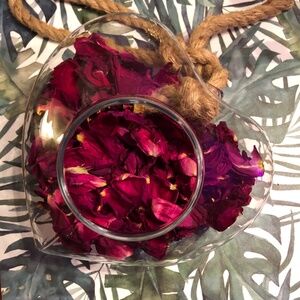 Charming heart-shaped glass terrarium. Filled with rich pink petals. Ideal for Valentines Day, Weddings, Showers, Garden Decor.