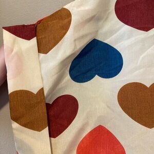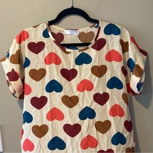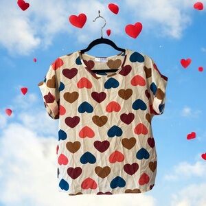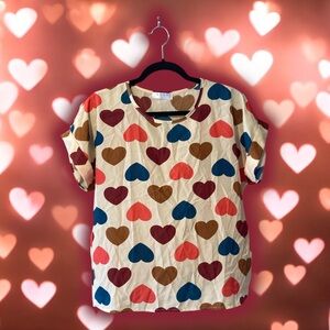 Foreign brand, cream coloured short sleeve top with pink/burgundy/navy hearts print. Rolled cuff on sleeves, stitched in place. Measures 21-21-5β PTP. Lightweight, perfect for spring and summer.