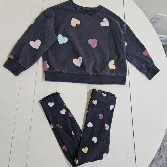 Adorable girls dark grey sweater and leggings set featuring a playful heart pattern. Perfect for adding a touch of fun to any outfit.