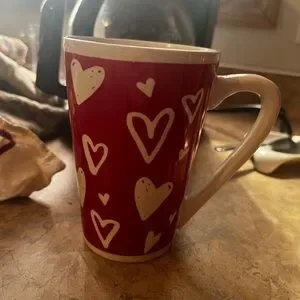 Enjoy your favorite beverage in this charming red mug adorned with white heart patterns. Perfect for adding a touch of love to your daily routine.