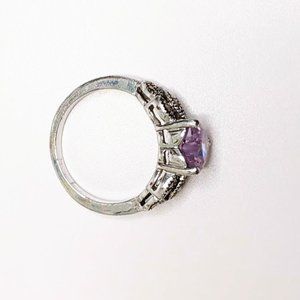 Silver plaited size 7.5 ring with synthetic with 8mm synthetic Alexandrite heart gem stone. Copper starting to show through the bottom of the ring and lisstle bit on prongs. Base colour of pale purple with blue & pink sparkle. Side wings have hematite stones. Still a very sparkly, pretty ring.