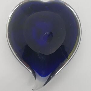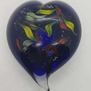 Heart Shaped Cobalt Blue Red Yellow Green Infused Swirls Art Glass Paperweight