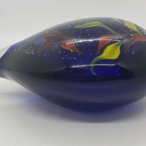 "PRE-OWNED" and so colourful! Approx. size: 4.25 (W) x 4.75 (L) x 2" (H). There is a thin surface chip on the bottom which does not comprise the integrity or structure of the paperweight. All in all, this art glass is in amazing condition for it's age. It's a uniquely shaped and coloured piece of art glass that will fit in with all decor styles. It's mid-Century/Modern look is subtle and smooth.
