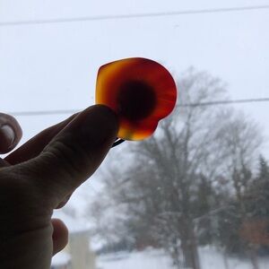 Gorgeous red stone with a sort of yellow/orange accent. I have no idea what stone this is but it’s very pretty. When held up to natural light, there are translucent properties. Leather necklace with metal clasp. Unmarked. Would make a lovely addition to a Valentine’s Day outfit!