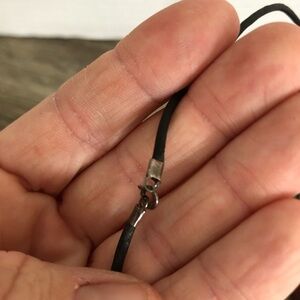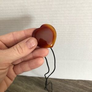 Gorgeous red stone with a sort of yellow/orange accent. I have no idea what stone this is but it’s very pretty. When held up to natural light, there are translucent properties. Leather necklace with metal clasp. Unmarked. Would make a lovely addition to a Valentine’s Day outfit!