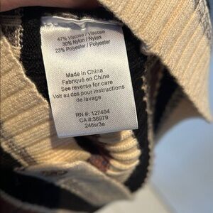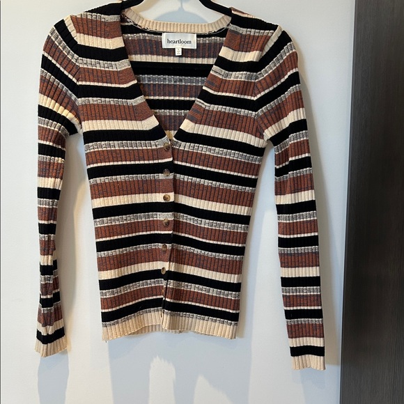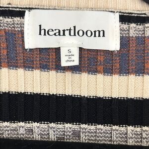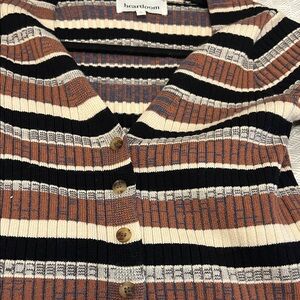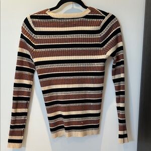 Chic Heartloom sweater with ribbed texture. Features multicolor stripes in black, cream, and brown. Excellent condition. Nice soft material.