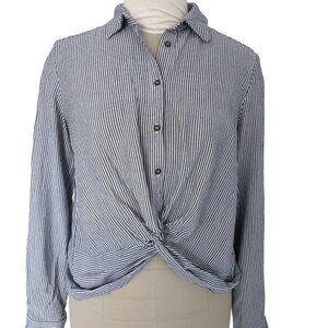 This is a grey and white striped button down shirt with a twist front hem by Heartloom.
