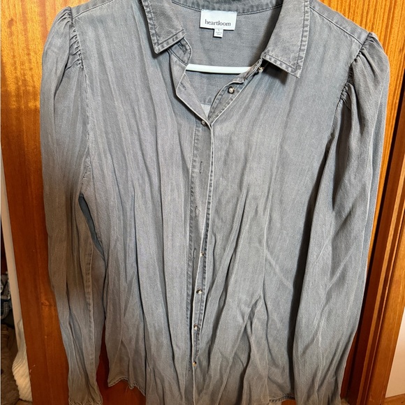 Lightweight washed grey blouse with button-front closure. Subtle puff shoulders and long sleeves. Soft, denim-like drape for casual layering.