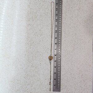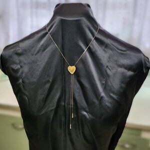 Fashionable Gold toned Heart/nugget with Rhinestones styled Bolero necklace with tear drop dangles. 30 inches in total, 15 inches drop. Adjustable. Great preloved condition overall.