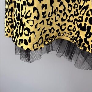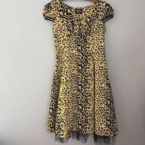 Hearts & Roses London leopard print fit-and-flare dress. Sweetheart neckline, cap sleeves with black trim, fitted waist, flared skirt with black tulle hem. Concealed back zipper. Excellent condition.