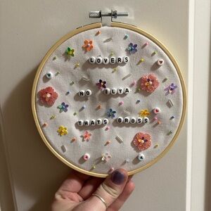 Decorative embroidery hoop with colorful floral accents and a classic quote from the cottage episode. Handmade by me