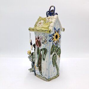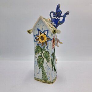 The Heather Goldminc 2000 Clayworks Blue Sky Four Seasons - Spring Tealight House is a collectible ceramic piece from a limited edition series created by Canadian artist Heather Goldminc.