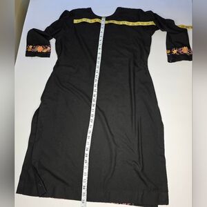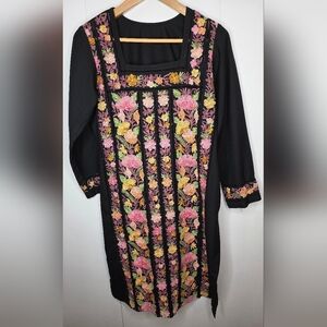 Black embroidered shift dress with splits on the sides. The front of the dress is embroidered and the back, sleeves and neck are a black cotton blend like fabric. there is no label to identify it. It can be worn as a dress or a tunic with pants.