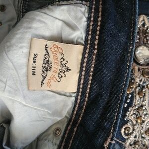 These jeans are awesome. Brand name is Grace in LA. New without tags Size 11 Easy Fit. Back Pockets are heavily embroidered and rhinestone studded. Front pockets are also embroidered heavily and studded. Lower Waist. New without tags.