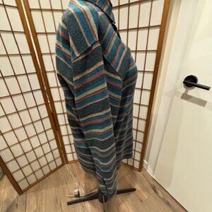 This mens shirt is made of 100% cotton in a thicker weight similar to flannel. The fabric is striped in fall shades of blue, brown, heather and gold. Shirt is roomy with regular collar and cuff. In good condition, great layering piece. Shirt has button front closure and a breast pocket.