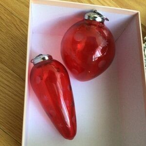 These 2 red glass ornaments are in excellent condition. I will pack carefully to ensure they arrive safely.