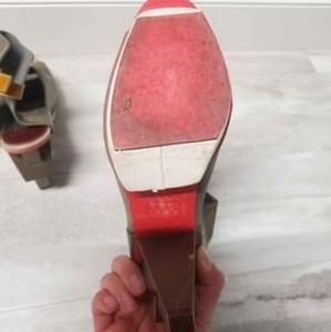 Size US 7 open-toe heel with adjustable velcro ankle strap. Worn 1-2x. Slight wear/residue on heel. Such a fun look, it's just a bit too small! Really wanted to keep it!