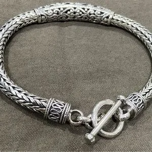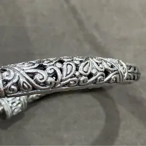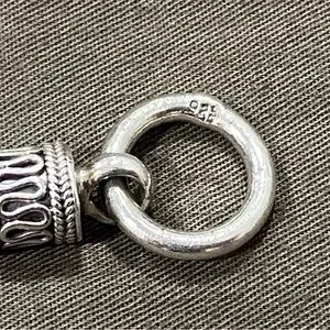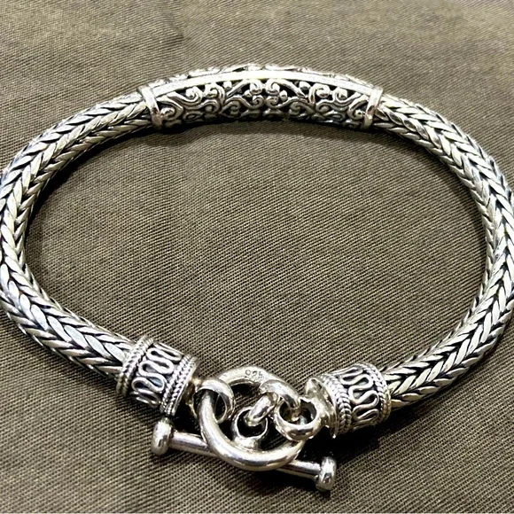 Originally suspected to be made in Bali, not verified. Made from solid sterling silver, the centrepiece is a large hollow bead. Fits 8” wrist. Stamped “925” this piece is very heavy and in excellent, barely worn condition.
