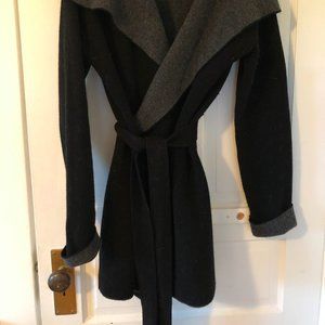 Long, thick wool (65% wool) sweater with tie at waist. No buttons. Made in Italy.