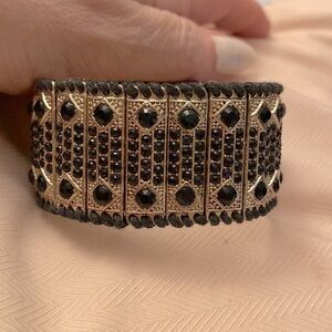 Heavy stretch bracelet w/ black rhinestones in an antique gold plating. 5cm inner diameter when not stretched.