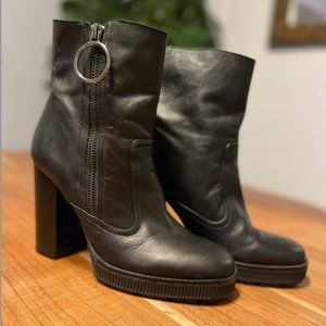 Heeled 100% Leather Boots, Side Zipper with Hoop Detail, Black, Size 8