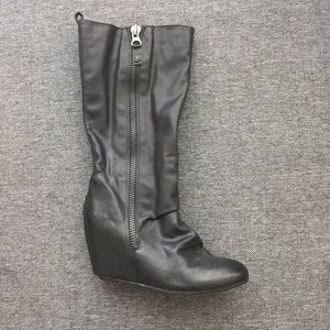 All black heeled boots with zipper detail on both sides of the boots. Pleather material. Great condition. Lightly worn.