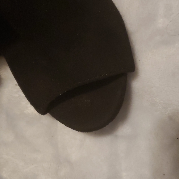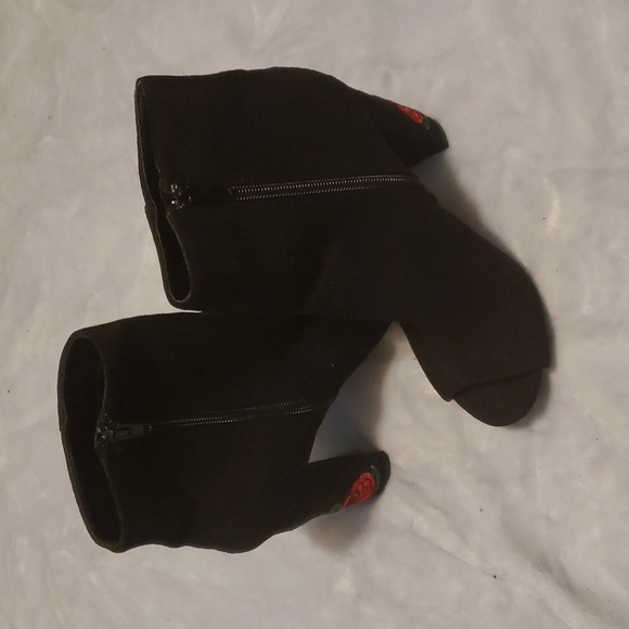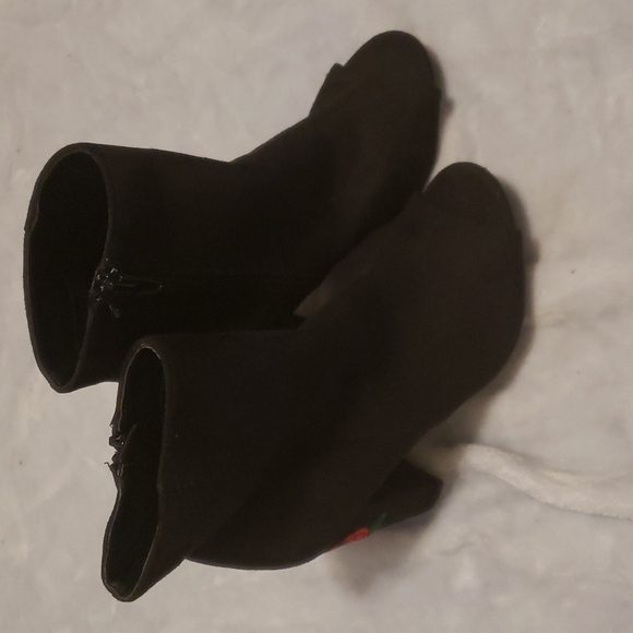 these have never been worn, they're black with open toe and have beautiful rose detailing on the heels these are a thick heel so much easier to walk in then a stiletto n they're around 3 inches high maybe a bit more but not much, they're a size 6 there mint condition I never wore them but I have a room with shoe cubbies on all the walls so I threw away the box