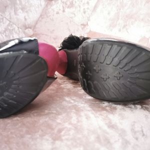 Black with purple heels. Flowers on the side. Never worn from a smoke free home