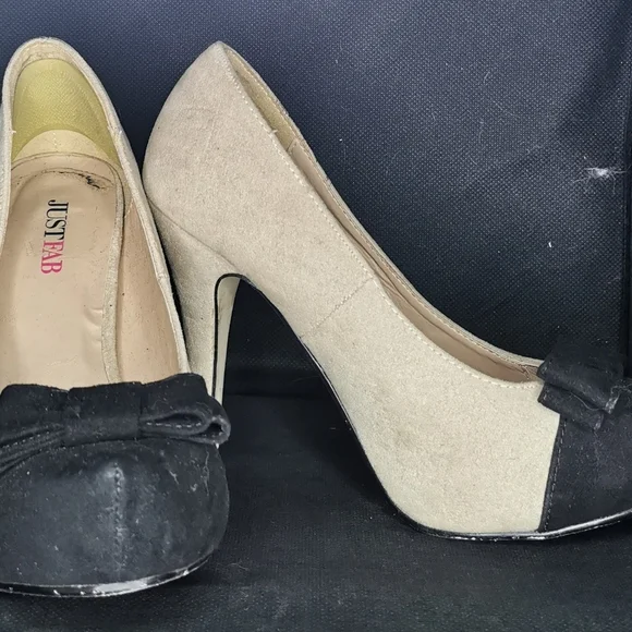 size 6 just fab heels with black bow, black toe tip, beige body.
