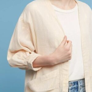 This Anthropologie cardigan sweater in a soft cream hue offers a relaxed fit with its open front design and long sleeves. Crafted from a knitted fabric, it features a subtle pattern that adds texture and elegance. Perfect for layering, this cardigan combines comfort and style effortlessly.