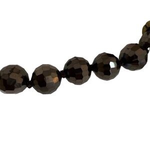 This show-stopping Heidi Daus necklace features a dramatic circular medallion pendant encrusted with clear and smoky crystals in an antique gold-tone setting. The beaded strand is made of faceted smoky grey beads and includes an adjustable chain clasp (18–22"). This bold piece blends vintage glamour with intricate craftsmanship and comes with the original branded gold box and paperwork. Heidi Daus is known for her collectible statement jewelry, with pieces often featured on HSN and in designer costume jewelry collections.  This design is one of her iconic Art Deco-inspired works.