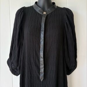 Chic and effortlessly stylish Heidi Merrick dress in classic black. Features a textured crinkle fabric with a lightweight, flowy drape. The dress is accented with faux leather trim along the collar and button placket, adding a sleek modern edge. Puff 3/4 sleeves with subtle gathering at the shoulders give it a sophisticated, fashion-forward silhouette.