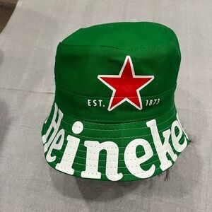 Stylish green bucket hat featuring Heineken branding. Perfect for casual outings.