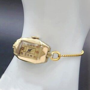 Refurbished with brand new crystal and stainless steel bracelet (band can be changed free of charge to any in-stock leather, metal, mesh or nylon band-message me with your preference) Helbros very old approx 1940's based on service date carved inside case, featuring 7-Jewel wind up mechanical movement in excellent running condition. Case 17mm Band 1.5mm. Current band opens to 9" and is adjustable down by easy slider adjuster. Gold polishes as if real but no markings to indicate. Normal wear on case and dial. Looks great for its' age.