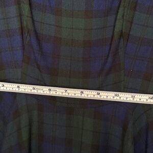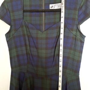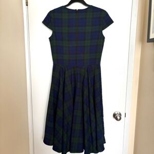 Green, blue, and black tartan retro flare dress. Good condition. Medium size, midi length, zip up back.