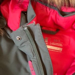 Pre loved in excellent condition, slight fraying on top of flap, not noticeable. Green and hot pink with fur detatch able hood size 2t but fits a little bigger. Worn one season