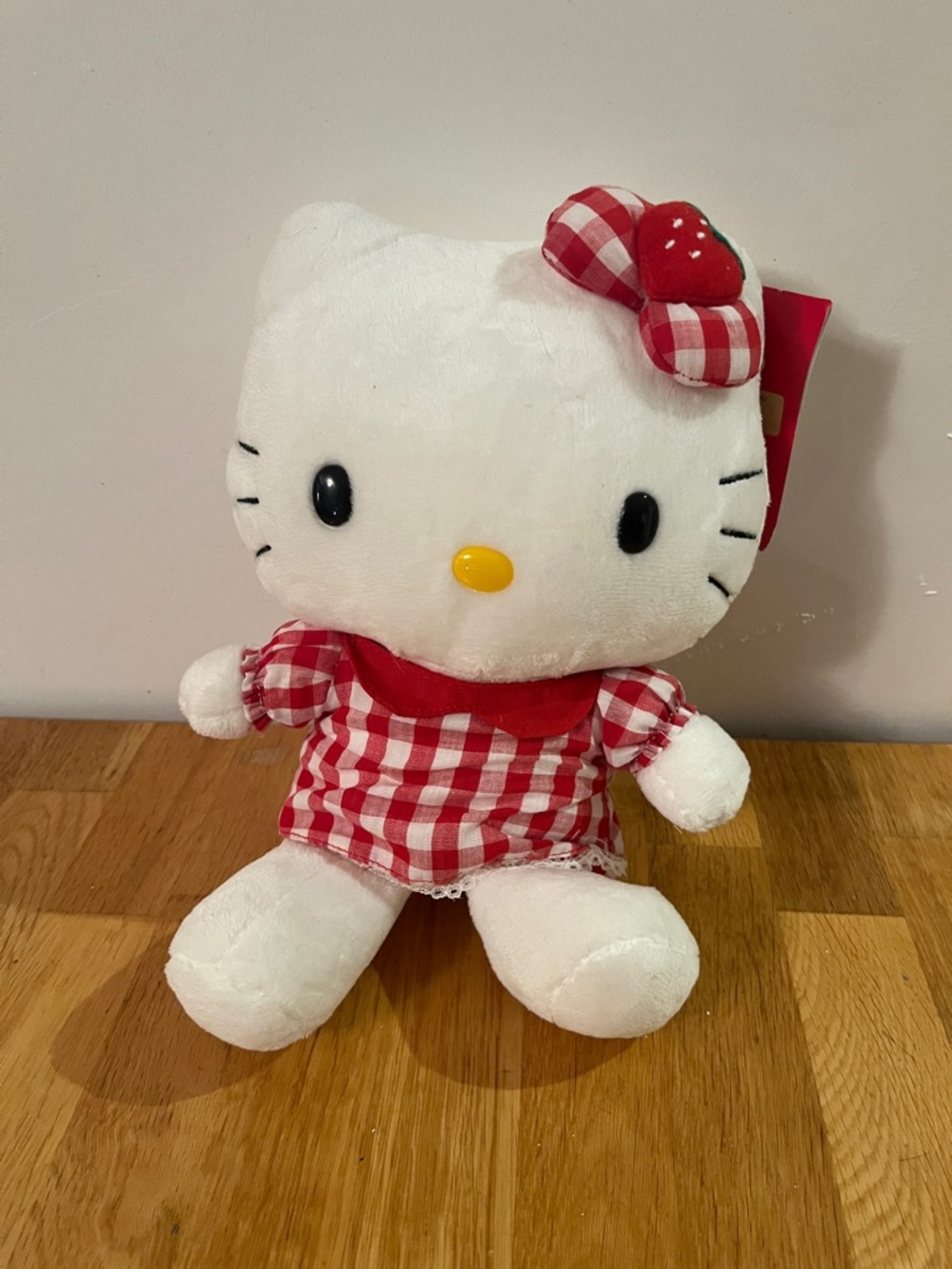 Classic Hello Kitty plush by Sanrio. Soft white plush with embroidered features. Adorable red gingham dress and matching strawberry bow. Small yellow nose and black eyes. Cute collectible for fans.