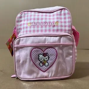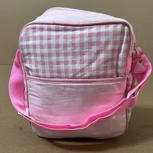 This baby pink Hello Kitty diaper bag has an adjustable shoulder strap and a cute gingham pattern. It has a plastic interior making it easy to wipe clean. Perfect for carrying your baby essentials.