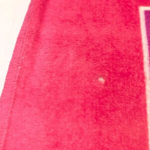 This blanket is pre-owned and in used condition. There are a few small stains on it. There is pilling and wear to the blanket. There are some small spots that are missing some fabric. There are some loose threads on it. It is missing the tag. Please see all photos for exact blanket.